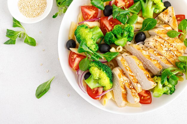 Grilled chicken or tofu salad with a variety of colorful vegetables (leafy greens,tomatoes, cucumbers, bell peppers)